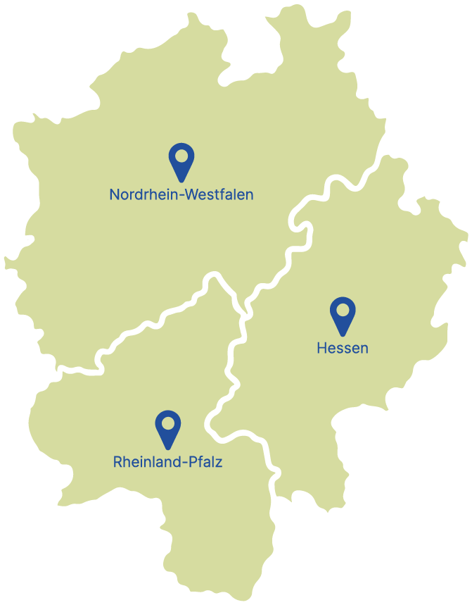 Unsere Kunden sind nicht nur in Großregionen wie Düsseldorf, Köln, das Ruhrgebiet sowie Frankfurt, Wiesbaden und Mainz, sondern umfassen das gesamte Bundesland Nordrhein-Westfalen, Rheinland-Pfalz und Hessen.